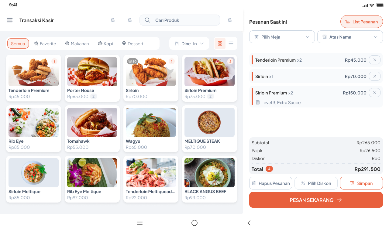 Aplikasi Kasir khusus untuk bisnis makanan dan minuman. Nikmati proses checkout yang cepat, pantau stok dengan akurat, dan lihat laporan penjualan dalam hitungan detik. Tingkatkan pengalaman pelanggan dan tingkatkan efisiensi operasional sekarang!"